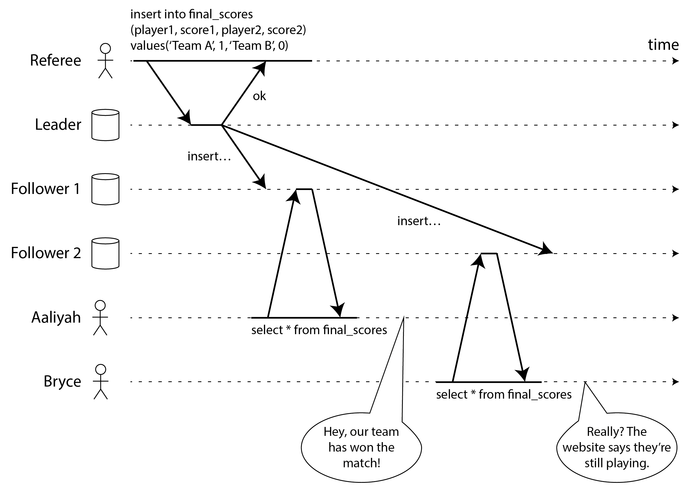 图 10-1 显示了一个非线性一致的体育网站示例 4。Aaliyah 和 Bryce 坐在同一个房间里,都在查看手机,想要了解他们最喜欢的球队比赛的结果。就在最终比分宣布后,Aaliyah 刷新了页面,看到了获胜者的公告,并兴奋地告诉了 Bryce。Bryce 怀疑地在自己的手机上点击了 刷新,但他的请求发送到了一个滞后的数据库副本,因此他的手机显示比赛仍在进行中。