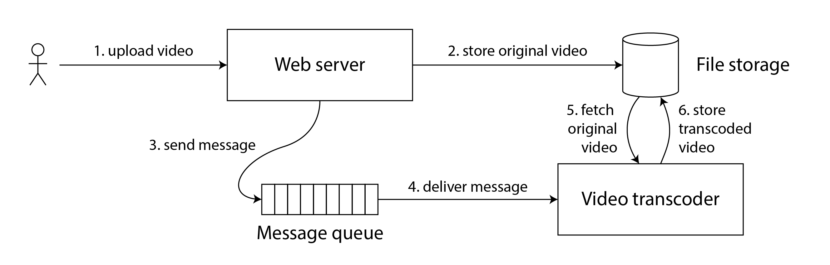 视频转码器需要明确指示执行转码作业,此指令通过消息队列从 Web 服务器发送到转码器(见 [Link to Come])。Web 服务器不会将整个视频放在队列中,因为大多数消息代理都是为小消息设计的,而视频可能有许多兆字节大小。相反,视频首先写入文件存储服务,写入完成后,转码指令被放入队列。
