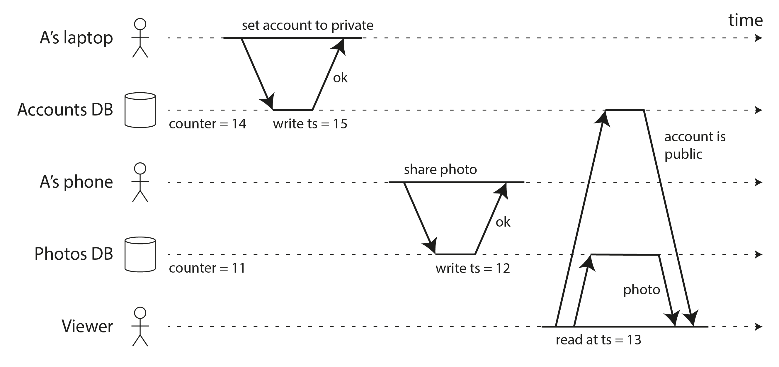 线性一致性不是避免这种竞态条件的唯一方法,但它是最容易理解的。如果你控制额外的通信通道(如消息队列的情况,但不是 Aaliyah 和 Bryce 的情况),你可以使用类似于我们在 “读己之写” 中讨论的替代方法,但代价是额外的复杂性。