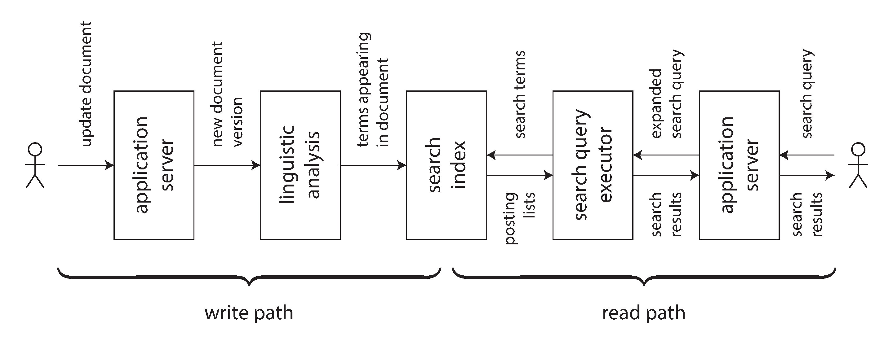 例如,为了处理任意关键词的搜索查询,将 OLTP 数据库与全文检索索引集成在一起是很常见的需求。尽管一些数据库(例如 PostgreSQL)包含了全文索引功能,对于简单的应用完全够了【1】,但更复杂的搜索能力就需要专业的信息检索工具了。相反的是,搜索索引通常不适合作为持久的记录系统,因此许多应用需要组合这两种不同的工具以满足所有需求。