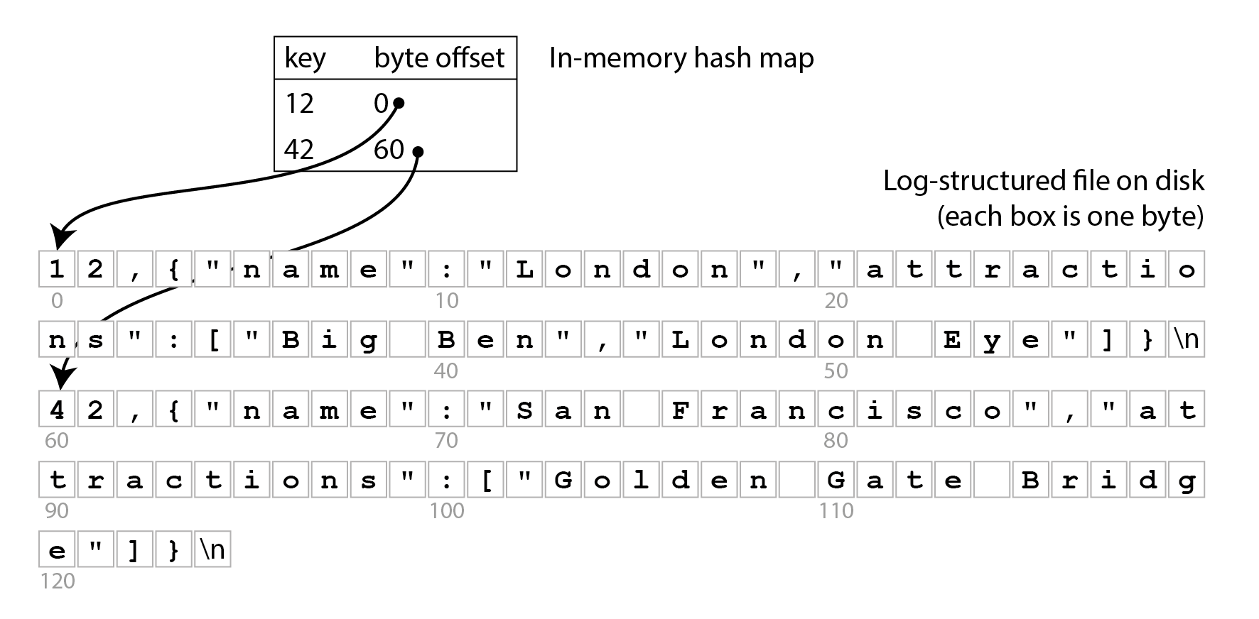 每当你向文件追加新的键值对时,你也会更新哈希映射以反映刚刚写入数据的偏移量。当你想查找一个值时,你使用哈希映射找到日志文件中的偏移量,寻找到该位置,然后读取值。如果数据文件的那部分已经在文件系统缓存中,读取根本不需要任何磁盘 I/O。