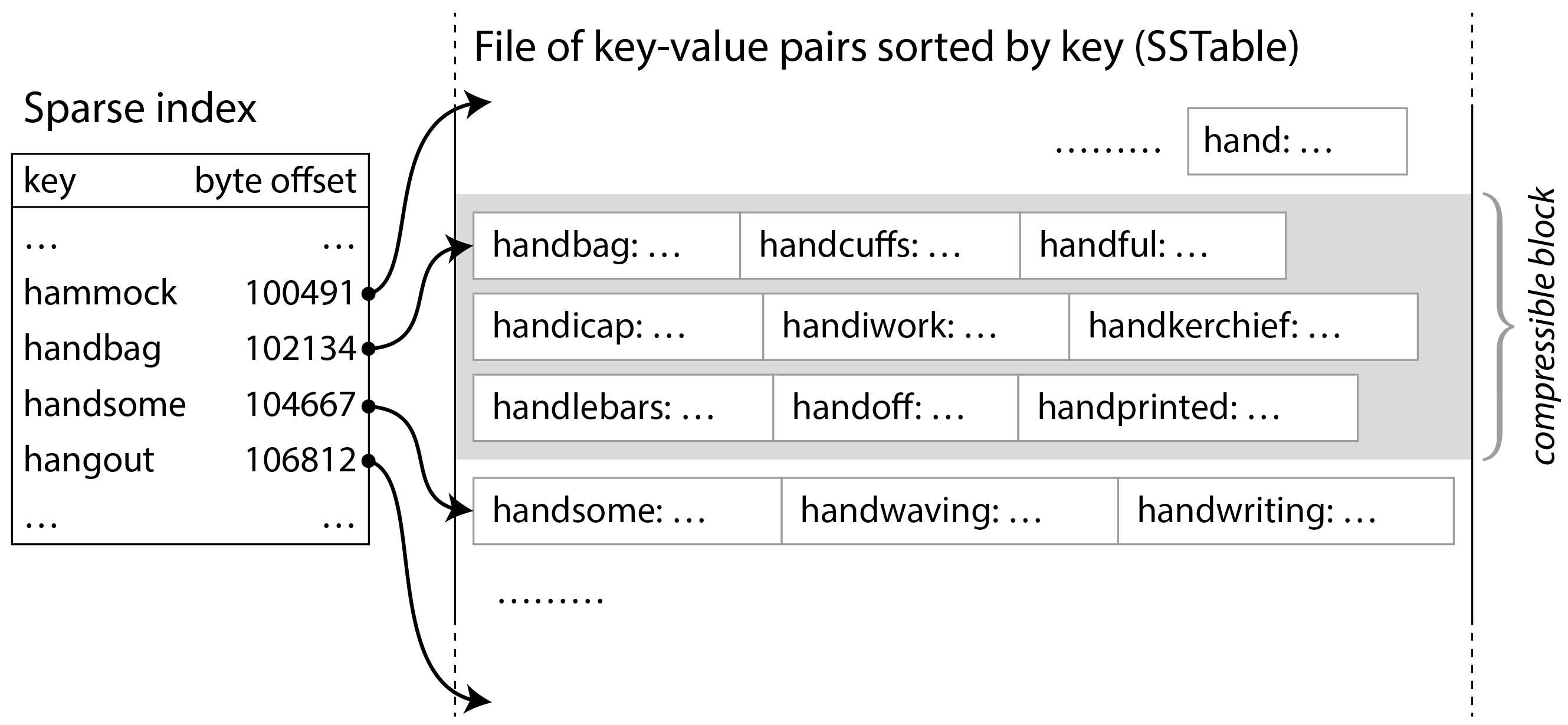 例如,在 图 4-2 中,一个块的第一个键是 handbag,下一个块的第一个键是 handsome。现在假设你要查找键 handiwork,它没有出现在稀疏索引中。由于排序,你知道 handiwork 必须出现在 handbag 和 handsome 之间。这意味着你可以寻找到 handbag 的偏移量,然后从那里扫描文件,直到找到 handiwork(或没有,如果该键不在文件中)。几千字节的块可以非常快速地扫描。