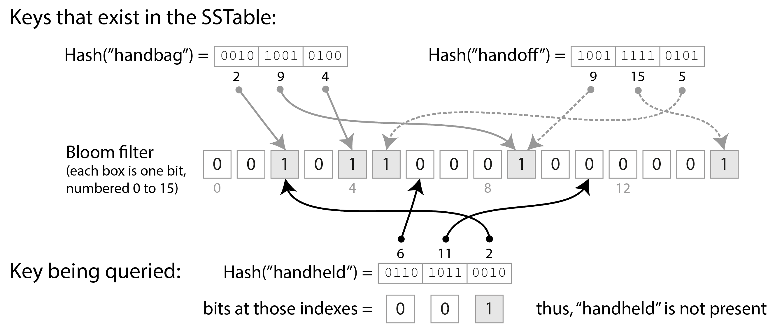 当我们想知道一个键是否出现在 SSTable 中时,我们像以前一样计算该键的相同哈希,并检查这些索引处的位。例如,在 图 4-4 中,我们查询键 handheld,它哈希为 (6, 11, 2)。其中一个位是 1(即第 2 位),而另外两个是 0。这些检查可以使用所有 CPU 都支持的位运算非常快速地进行。