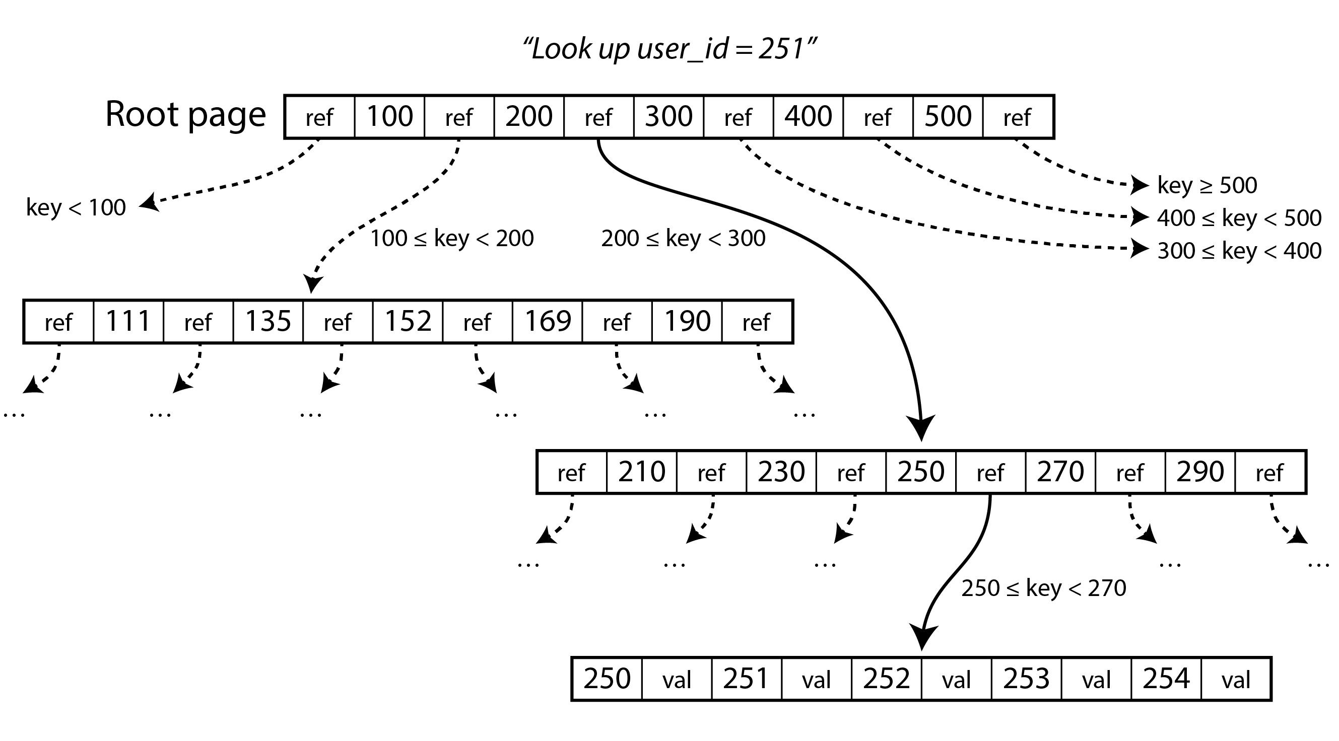 一个页被指定为 B 树的 根;每当你想在索引中查找一个键时,你就从这里开始。该页包含几个键和对子页的引用。每个子页负责一个连续的键范围,引用之间的键指示这些范围之间的边界在哪里。(这种结构有时称为 B+ 树,但我们不需要将其与其他 B 树变体区分开来。)