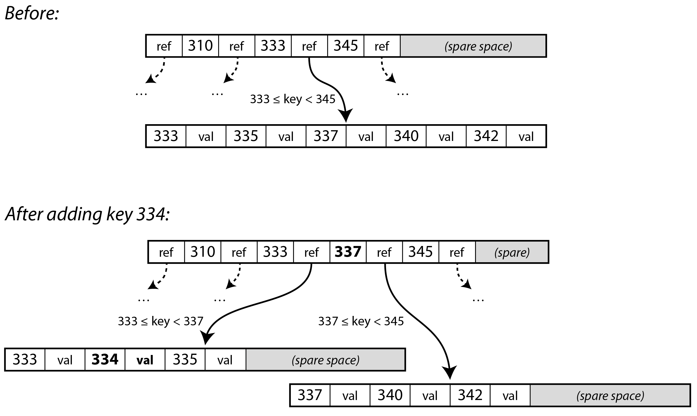 在 图 4-6 的例子中,我们想插入键 334,但范围 333–345 的页已经满了。因此,我们将其分成范围 333–337(包括新键)的页和 337–344 的页。我们还必须更新父页以引用两个子页,它们之间的边界值为 337。如果父页没有足够的空间容纳新引用,它也可能需要被分割,分割可以一直持续到树的根。当根被分割时,我们在它上面创建一个新根。删除键(可能需要合并节点)更复杂 5。