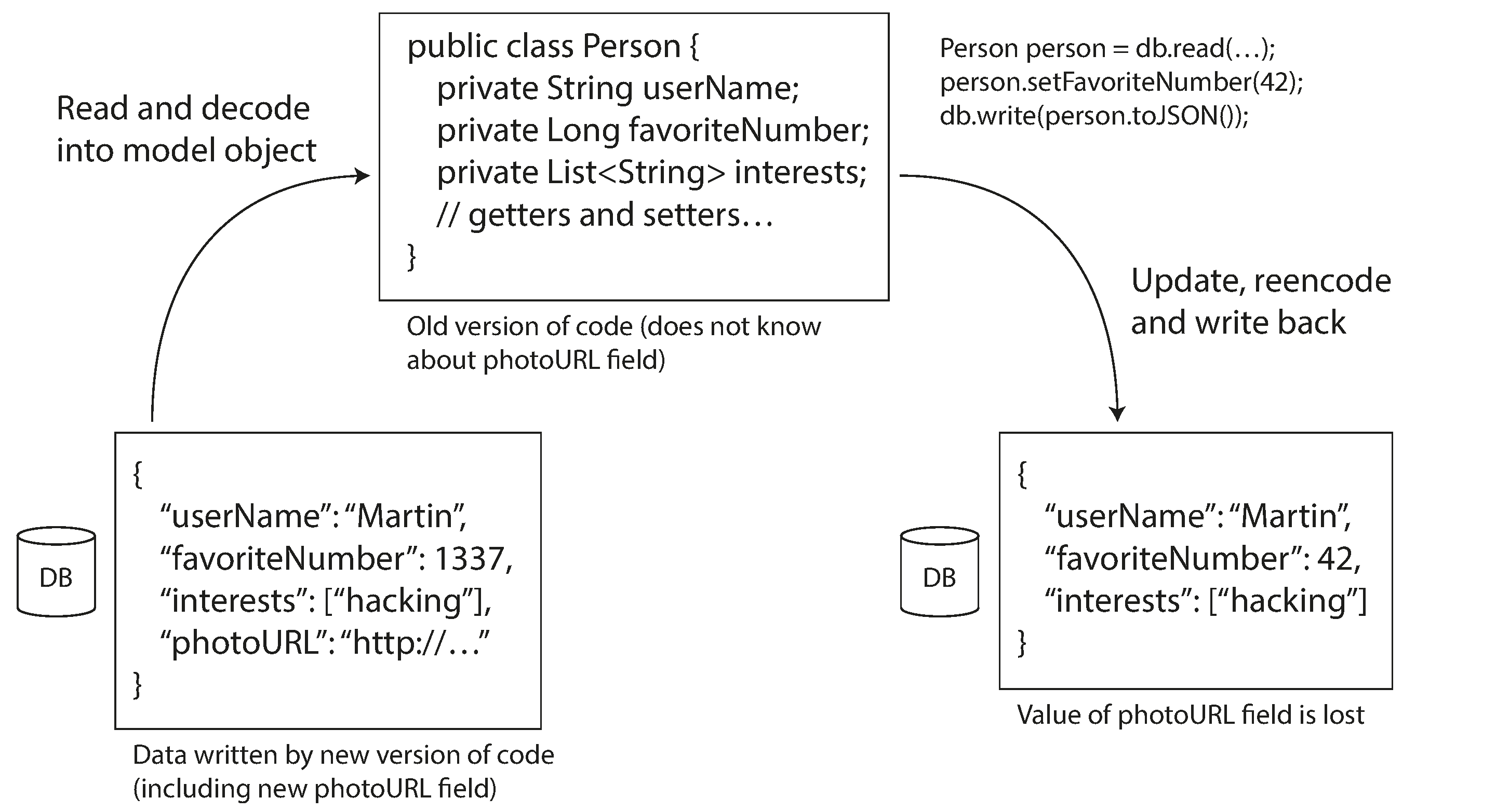 向前兼容性的另一个挑战如 图 5-1 所示。假设你向记录模式添加了一个字段,新代码创建了包含该新字段的记录并将其存储在数据库中。随后,旧版本的代码(尚不知道新字段)读取记录,更新它,然后写回。在这种情况下,理想的行为通常是旧代码保持新字段不变,即使它无法解释。但是,如果记录被解码为不显式保留未知字段的模型对象,数据可能会丢失,如 图 5-1 所示。
