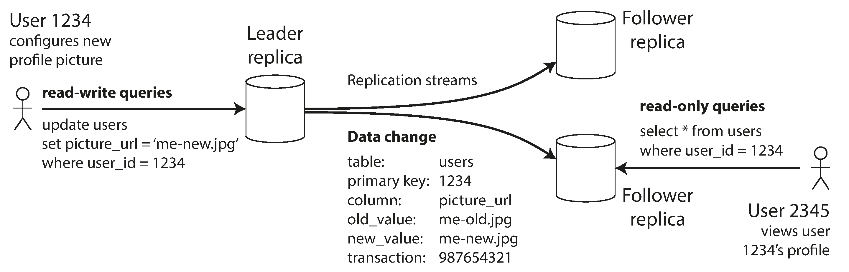 在 第 4 章 中,我们看到预写日志是使 B 树存储引擎健壮所必需的:每个修改首先写入 WAL,以便在崩溃后可以将树恢复到一致状态。由于 WAL 包含将索引和堆恢复到一致状态所需的所有信息,我们可以使用完全相同的日志在另一个节点上构建副本:除了将日志写入磁盘外,主节点还通过网络将其发送给其从节点。当从节点处理此日志时,它构建了与主节点上找到的完全相同的文件副本。