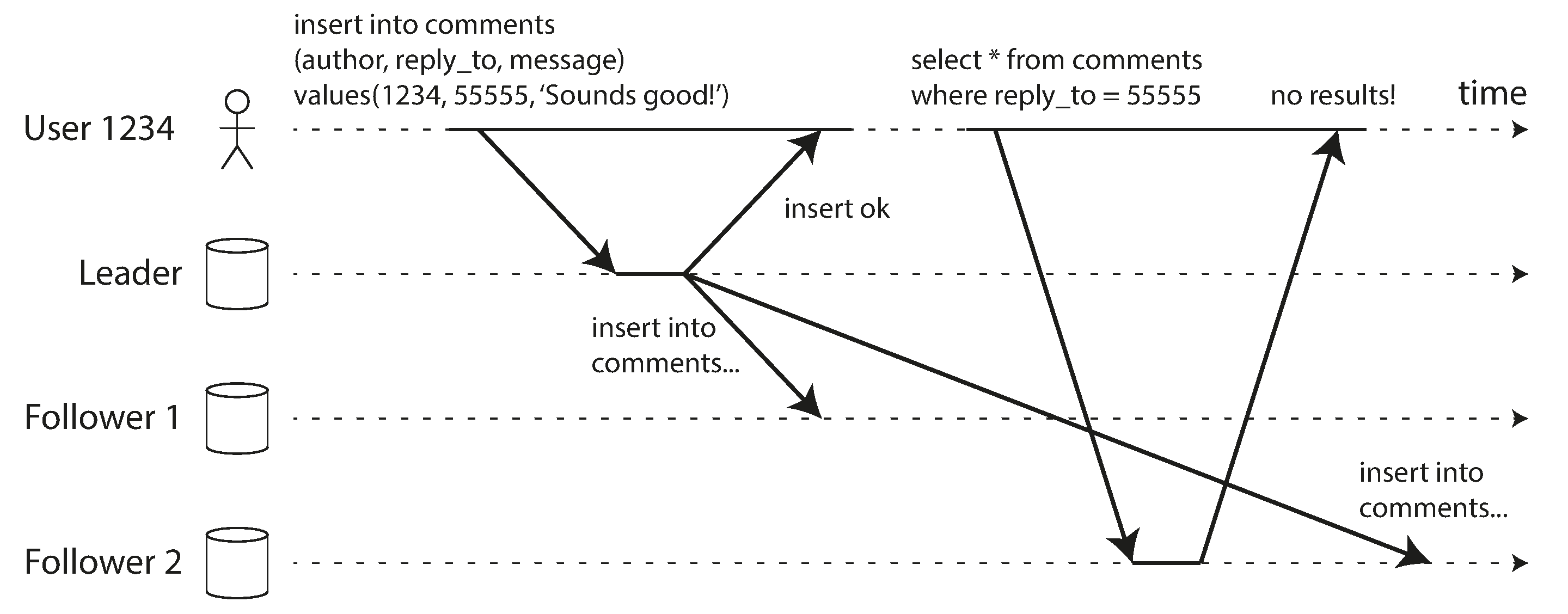 图中显示,从节点 2 处理消息之前有相当大的延迟。通常,复制相当快:大多数数据库系统在不到一秒的时间内将变更应用到从节点。然而,不能保证需要多长时间。在某些情况下,从节点可能落后主节点几分钟或更长时间;例如,如果从节点正在从故障中恢复,如果系统正在接近最大容量运行,或者如果节点之间存在网络问题。