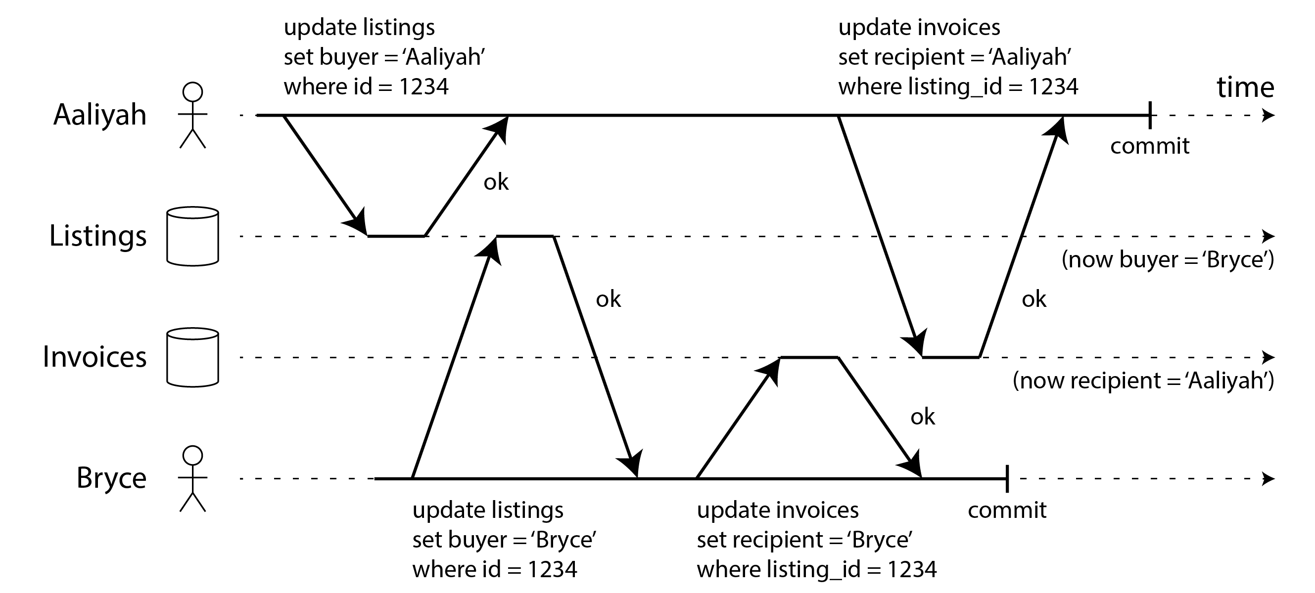 - 事务读取某些内容,根据它看到的值做出决定,并将决定写入数据库。但是,在进行写入时,决策的前提不再为真。只有可串行化隔离才能防止此异常。