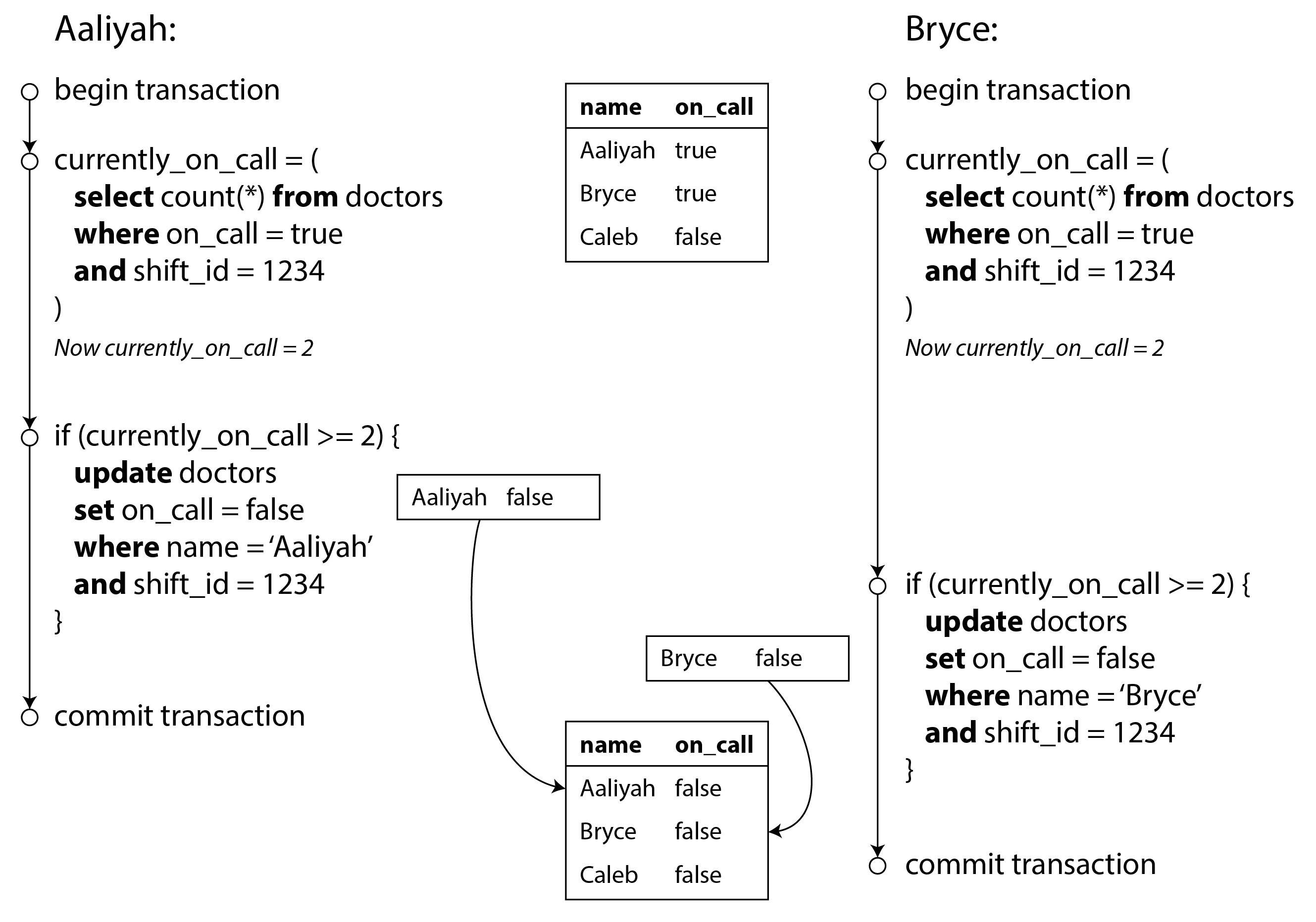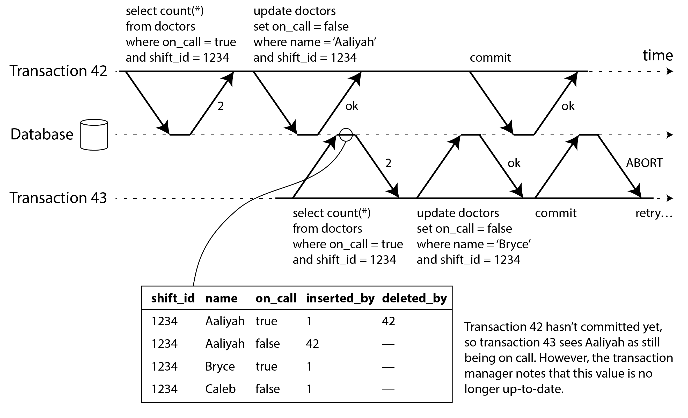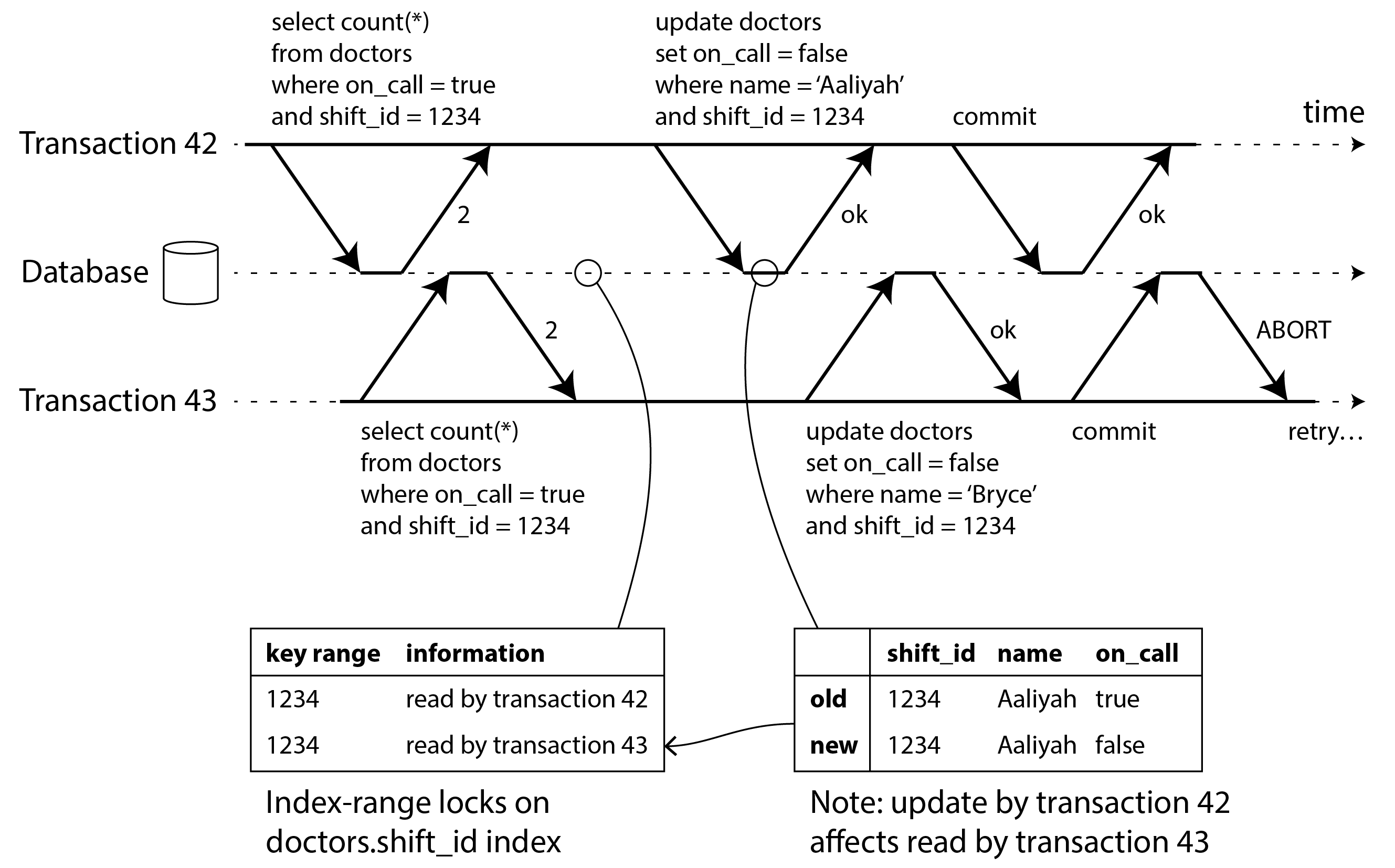 - 事务读取匹配某些搜索条件的对象。另一个客户端进行影响该搜索结果的写入。快照隔离防止直接的幻读,但写偏斜上下文中的幻读需要特殊处理,例如索引范围锁。