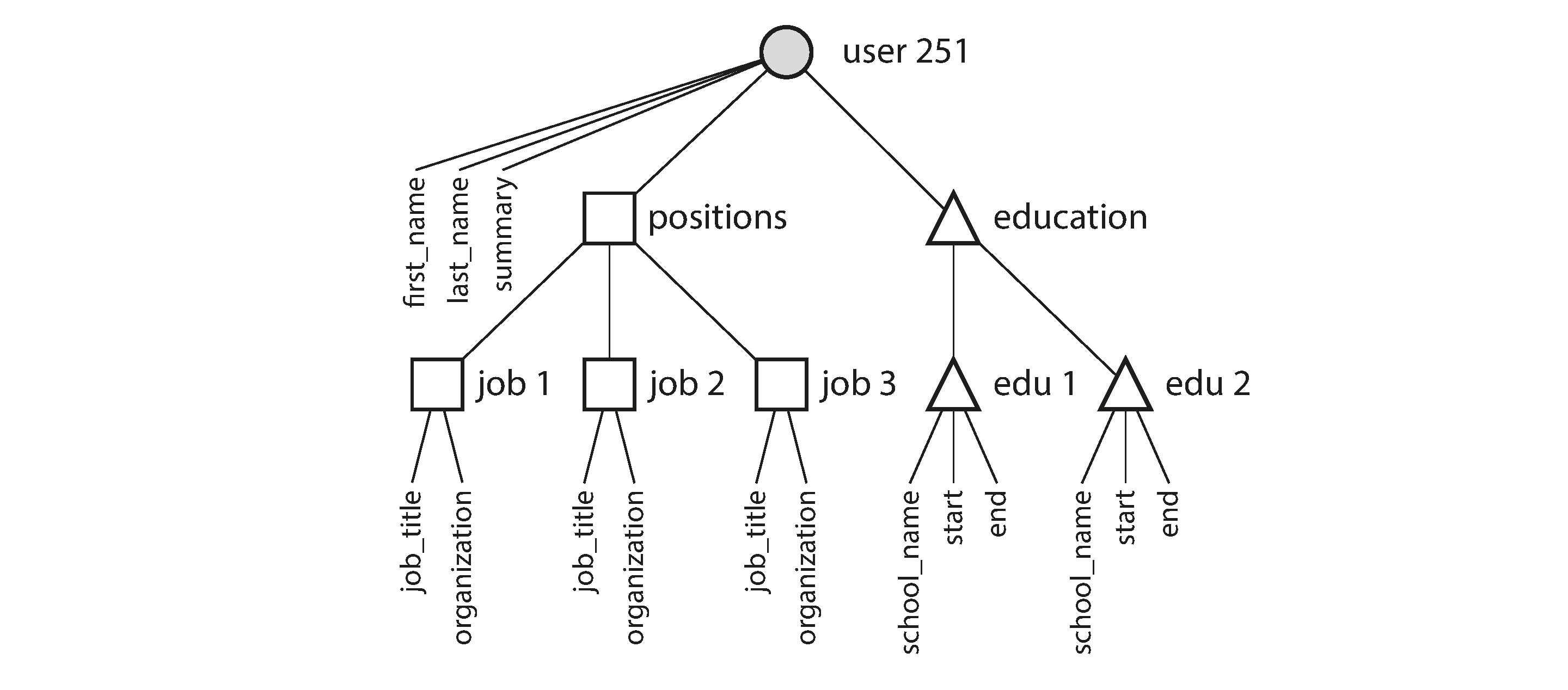 从用户简介文件到用户职位,教育历史和联系信息,这种一对多关系隐含了数据中的一个树状结构,而 JSON 表示使得这个树状结构变得明确(见 图 2-2)。