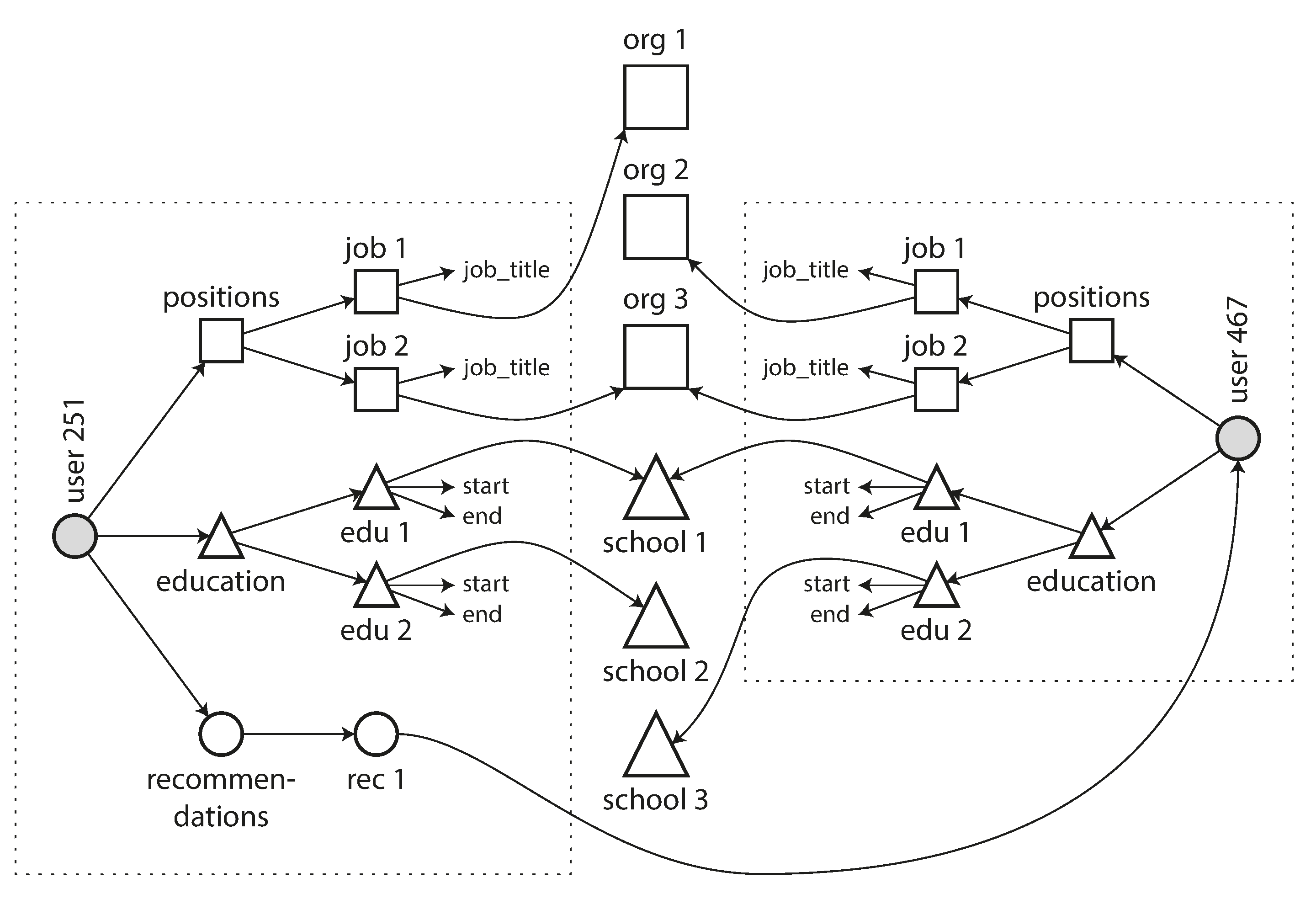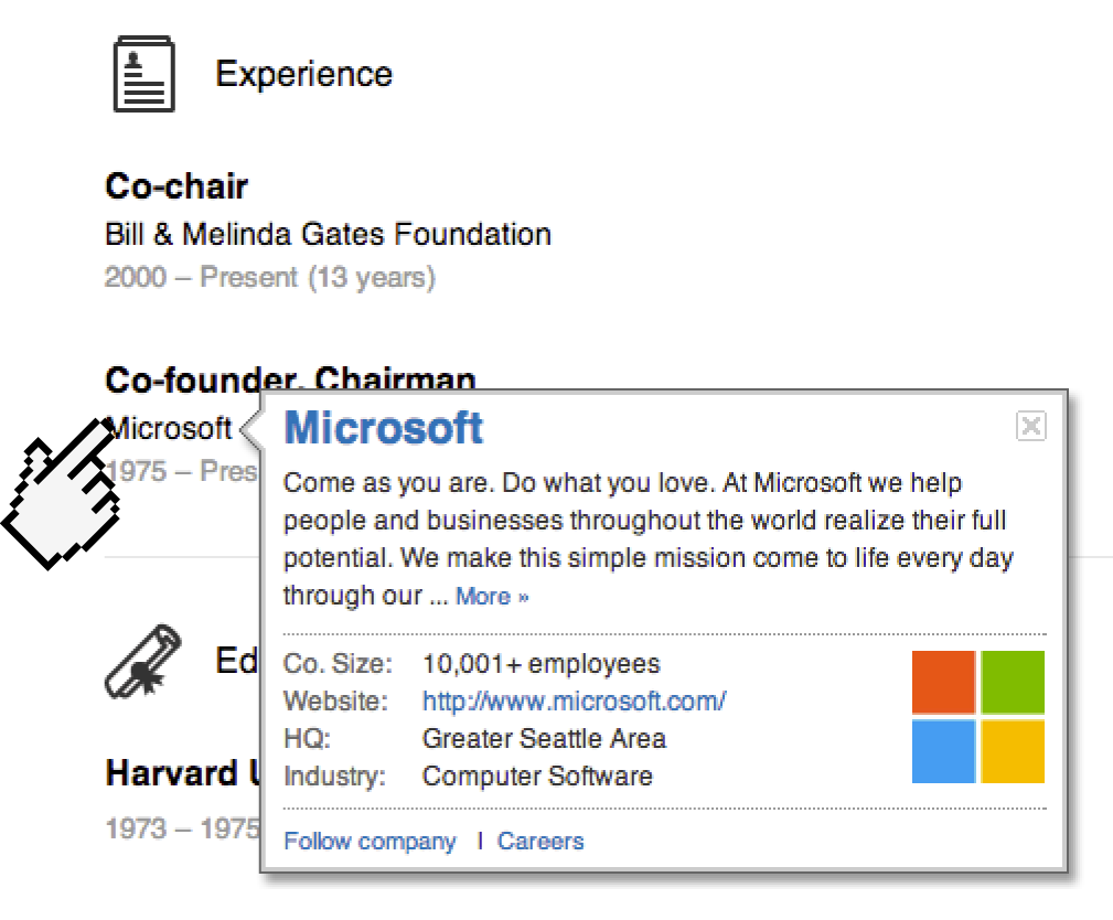 organization(用户工作的公司)和school_name(他们学习的地方)只是字符串。也许他们应该是对实体的引用呢?然后,每个组织、学校或大学都可以拥有自己的网页(标识、新闻提要等)。每个简历可以链接到它所提到的组织和学校,并且包括他们的图标和其他信息(请参阅 图 2-3,来自 LinkedIn 的一个例子)。 - 推荐