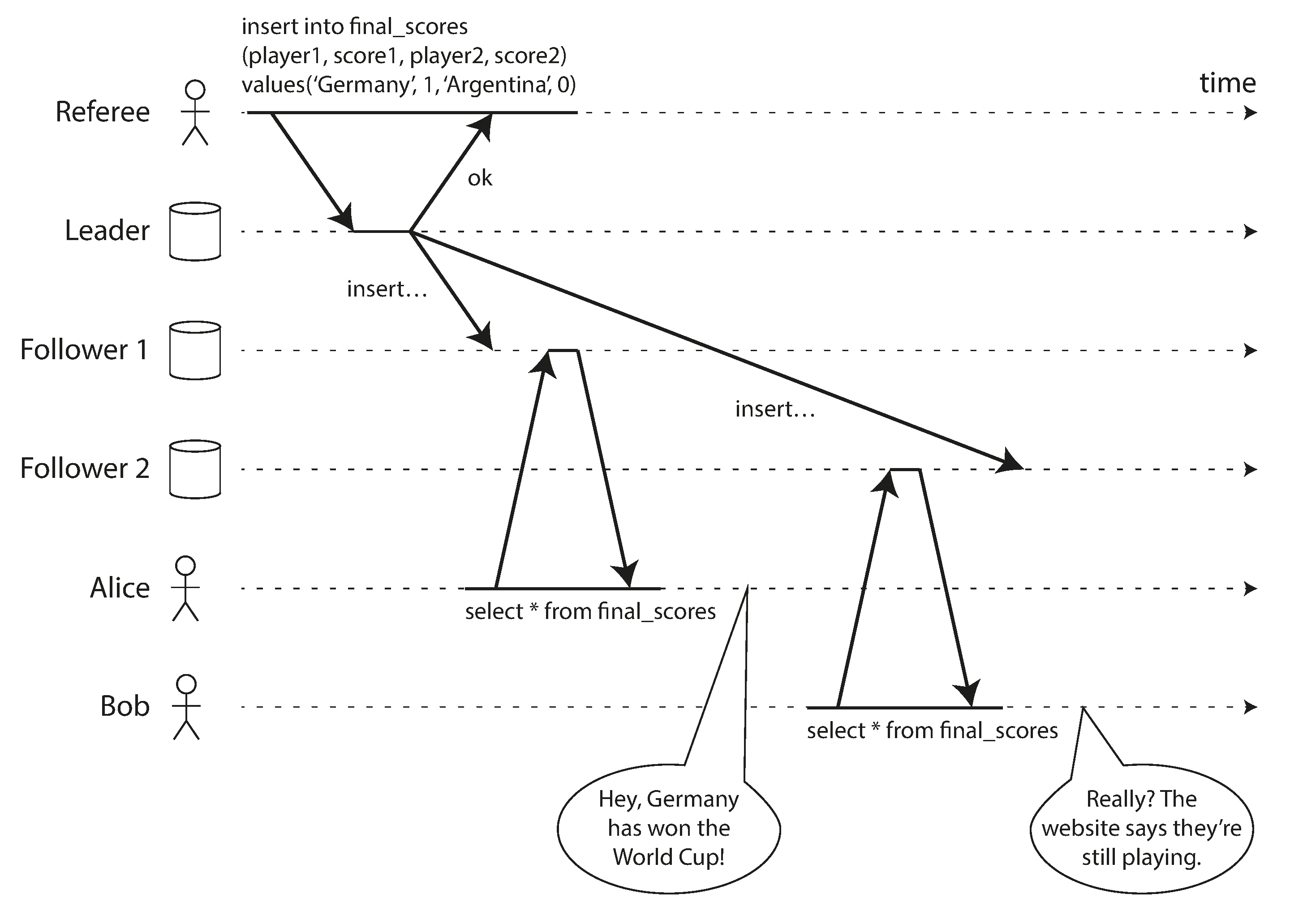 图 9-1 展示了一个关于体育网站的非线性一致例子【9】。Alice 和 Bob 正坐在同一个房间里,都盯着各自的手机,关注着 2014 年 FIFA 世界杯决赛的结果。在最后得分公布后,Alice 刷新页面,看到宣布了获胜者,并兴奋地告诉 Bob。Bob 难以置信地刷新了自己的手机,但他的请求路由到了一个落后的数据库副本上,手机显示比赛仍在进行。
