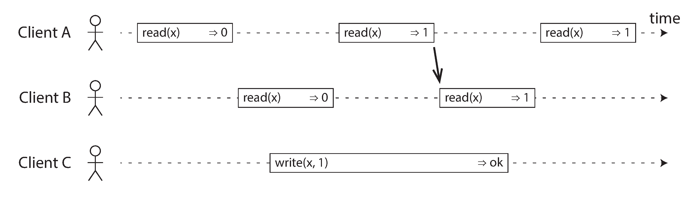 图 9-3 任何一个读取返回新值后,所有后续读取(在相同或其他客户端上)也必须返回新值。