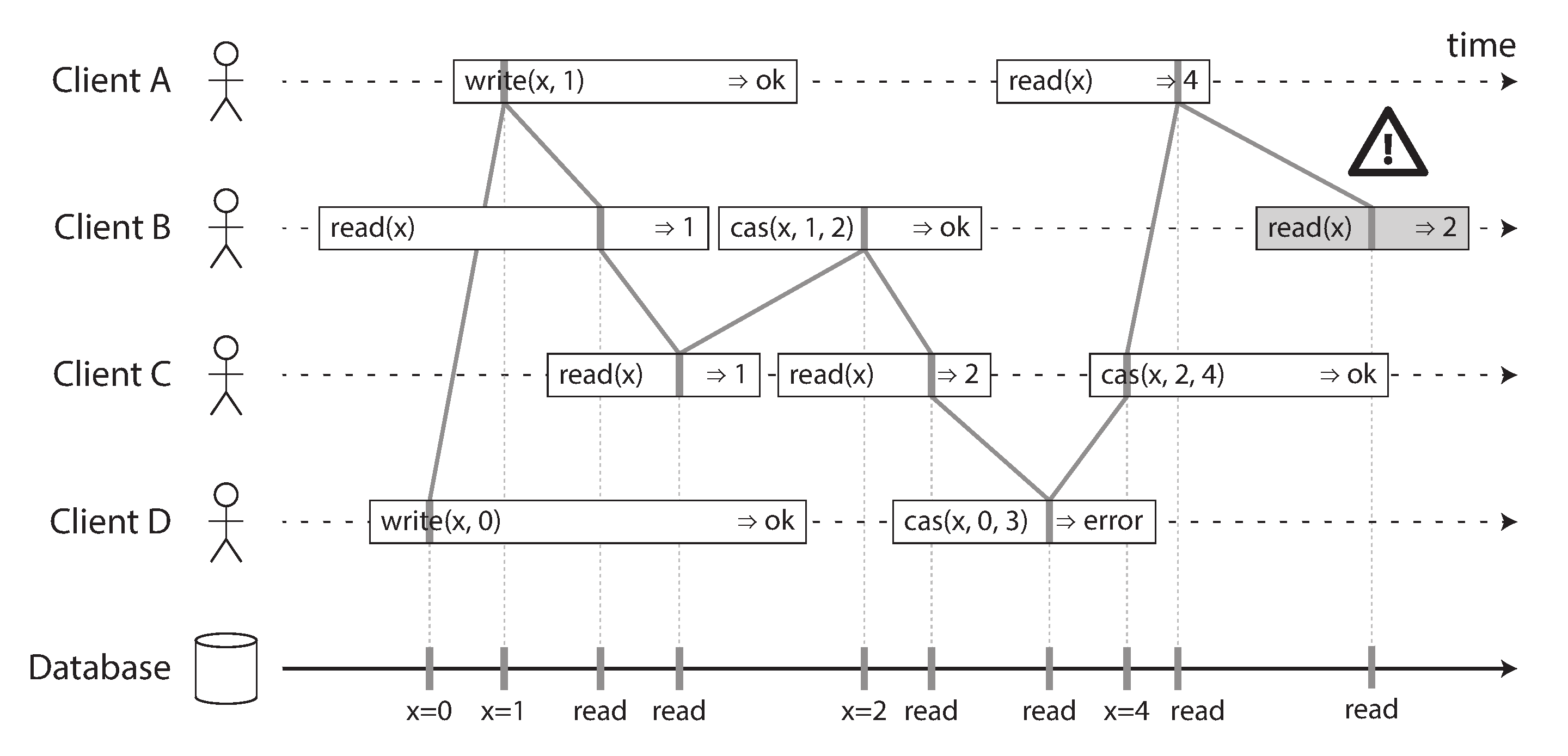 1,然后读取到2,因为两次读取之间的值被 B 所更改。可以使用原子 比较并设置(cas) 操作来检查该值是否未被另一客户端同时更改:B 和 C 的 cas 请求成功,但是 D 的 cas 请求失败(在数据库处理它时,x的值不再是0)。客户 B 的最后一次读取(阴影条柱中)不是线性一致的。该操作与 C 的 cas 写操作并发(它将