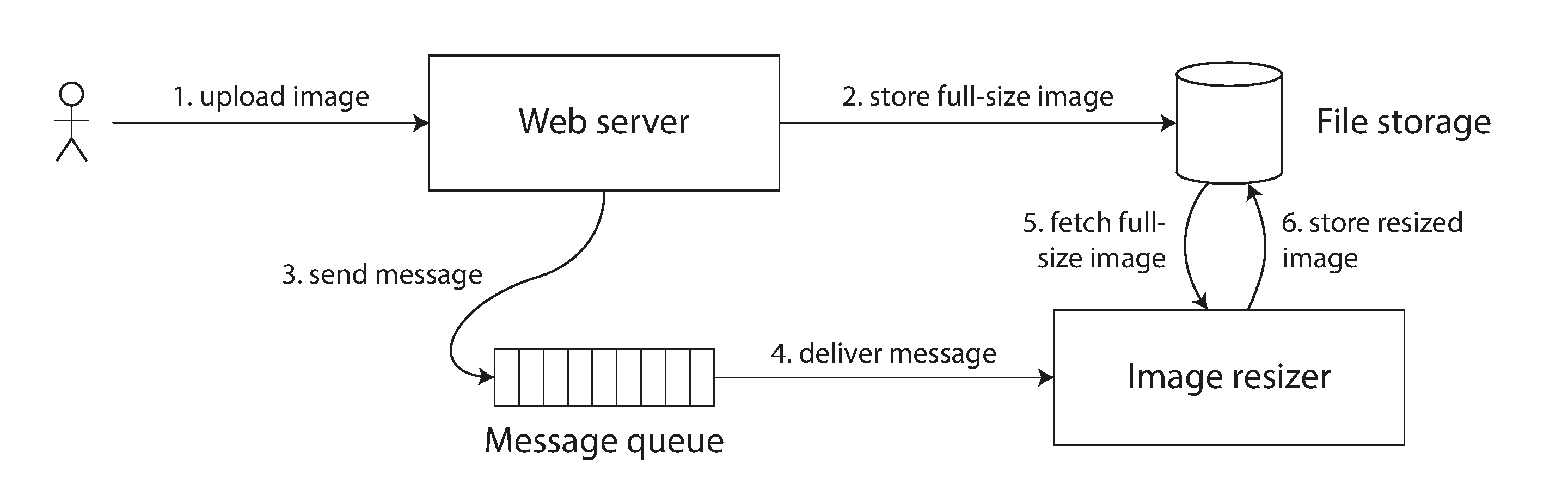 计算机系统也会出现类似的情况。例如,假设有一个网站,用户可以上传照片,一个后台进程会调整照片大小,降低分辨率以加快下载速度(缩略图)。该系统的架构和数据流如 图 9-5 所示。