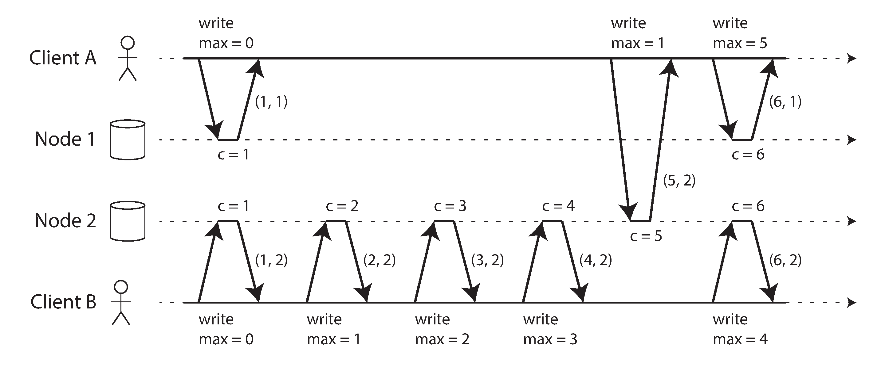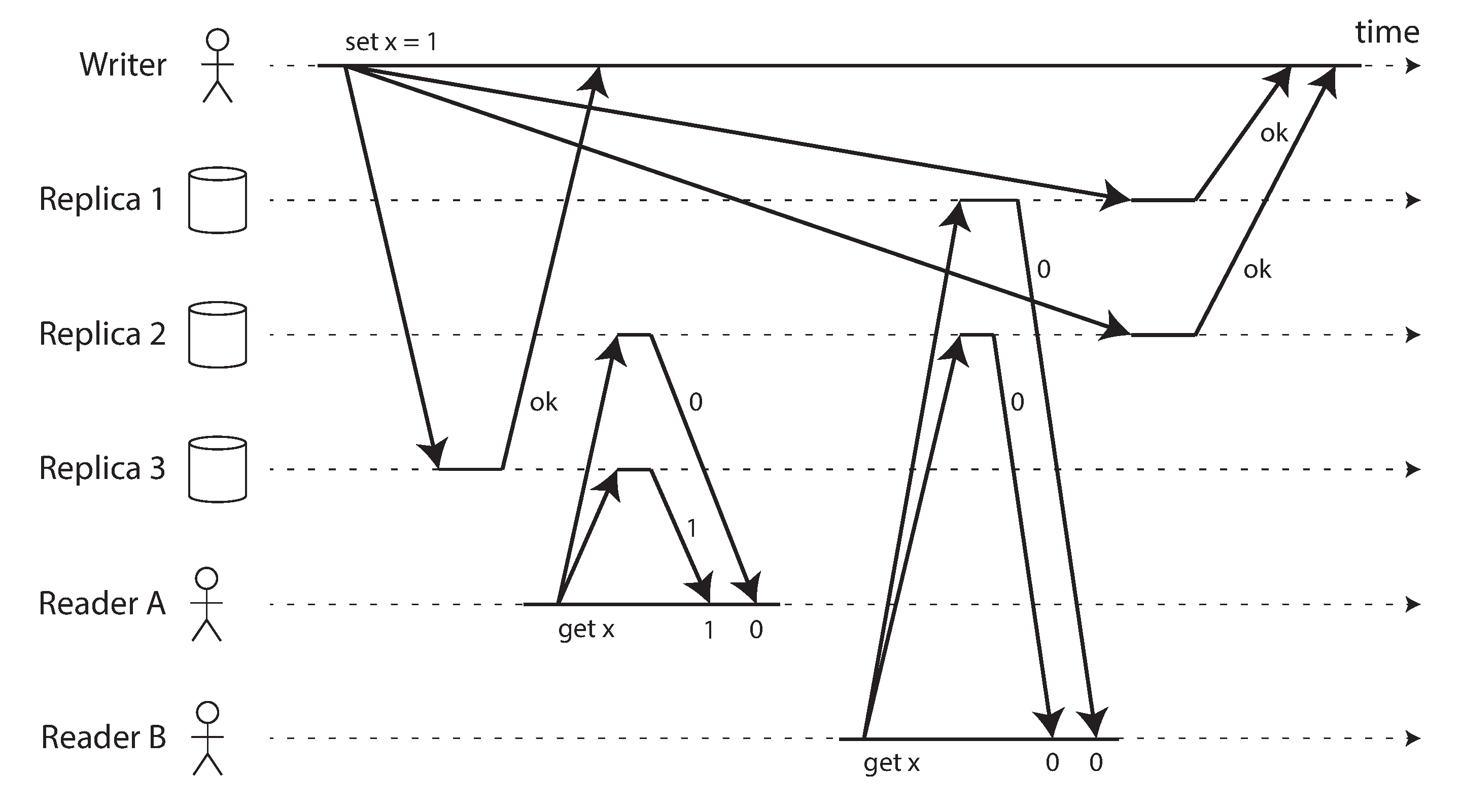 如果 Alice 和 Bob 在同一时间刷新并获得了两个不同的查询结果,也许就没有那么令人惊讶了。因为他们不知道服务器处理他们请求的精确时刻。然而 Bob 是在听到 Alice 惊呼最后得分 之后,点击了刷新按钮(启动了他的查询),因此他希望查询结果至少与爱丽丝一样新鲜。但他的查询返回了陈旧结果,这一事实违背了线性一致性的要求。