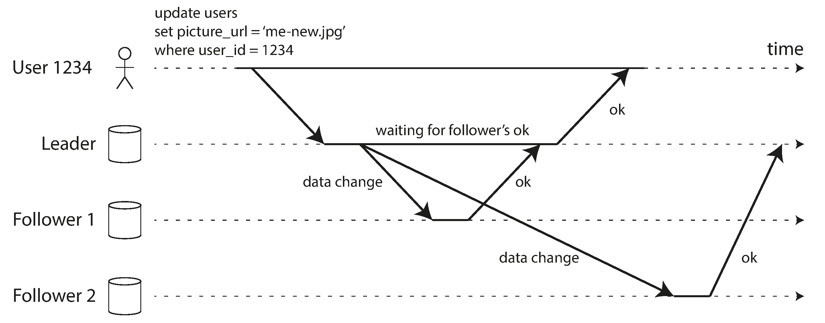 想象一下 圖 5-1 中發生的場景,即網站的使用者更新他們的個人頭像。在某個時間點,客戶向主庫傳送更新請求;不久之後主庫就收到了請求。在某個時間點,主庫又會將資料變更轉發給自己的從庫。最終,主庫通知客戶更新成功。